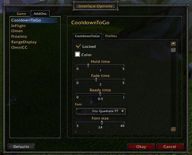 After installing, CooldownToGo will be enabled by default, and unlocked, so you'll see a semi-transparent rectangle in the center of your UI that you can drag to a position you like. After finding a good place for it you should lock the frame with /cdtg locked, so that it won't eat your mouse clicks.