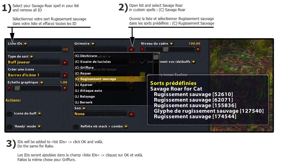 - Warning System: If a spell fails because you're too far or not behind your target, an icon will alert you (a cross if you're too far, a double arrow if you are in front of the target). Also pulse when you gain buff or/and debuff with the texture of debuff and his name.