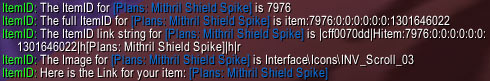 Ever want to know what the item ID is for an item your friend linked you? Well, with ItemID, all you have to do is link it an item, and it'll tell you the ID for it!