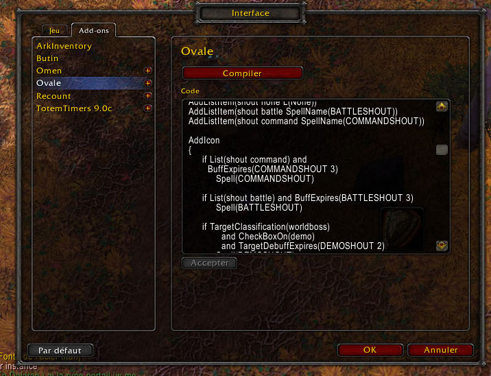 Default scripts are based on SimulationCraft. You may also customize the default script to suit your needs (see [Documentation][]) or use scripts made by other users. Tank scripts based on guides from Icy Veins are maintained by the Ovale_TankScripts addon.