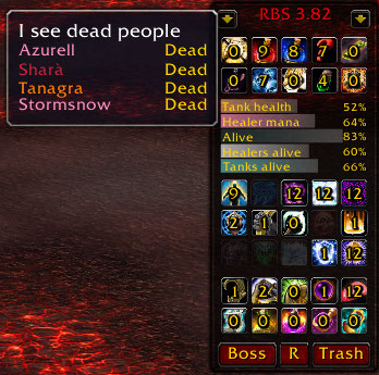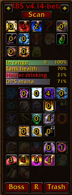 Reports on a configurable dashboard or to group chat on consumables, buffs, AFK, mana and many many others but in an intelligent automagic way. RBS is the last nail in the coffin of all slacking level max-level raiders. RBS also provides unique tank taunting warnings not provided by any other addon.