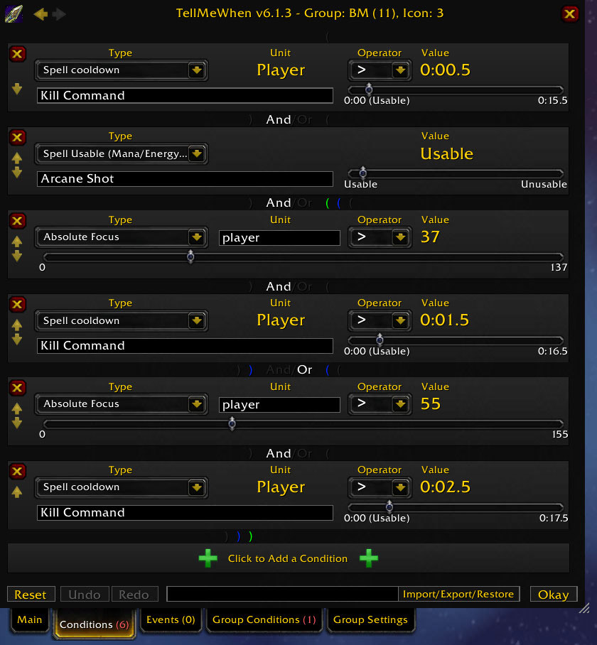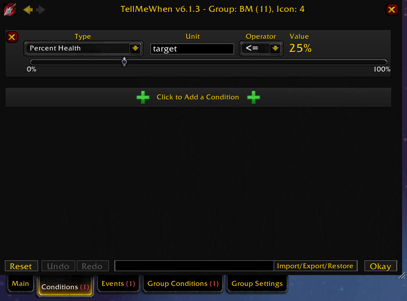 Conditions are a very powerful feature of TellMeWhen that allow you to narrow the circumstances under which an icon or group should show. To configure conditions for an icon, click the condition tab on the Icon Editor. Conditions can check a wide variety of things, and I recommend that you explore the condition type menu to see what is available. You can add multiple conditions to an icon, and you can group different conditions together for use with the Boolean operators AND and OR by clicking the parenthesis between each condition.