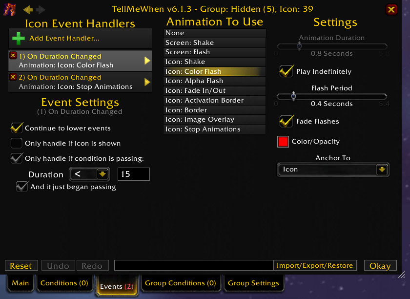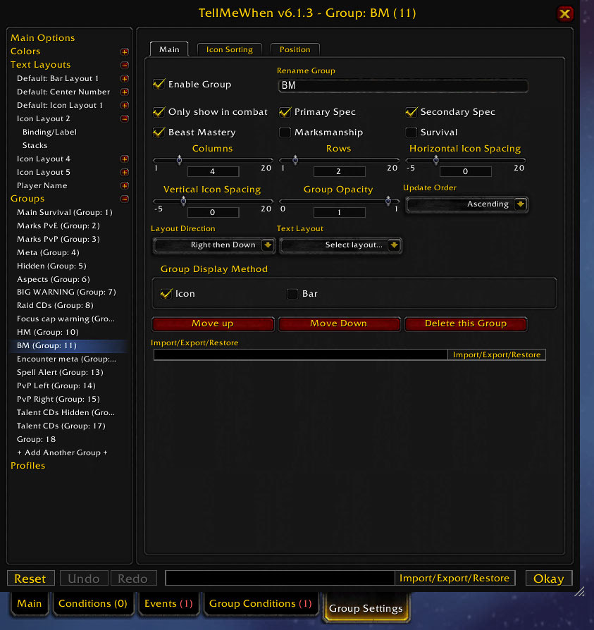 All TellMeWhen icons belong to a parent group. Each of these groups have many settings; some affect their appearance and size, while other affect their functionality. The options for a group can be accessed by typing "/tmw options", or by clicking the group settings tab on the icon editor. Groups can also have conditions set to govern when they are shown and hidden - accessed through the Group Conditions tab of the icon editor, they are configured exactly the same way as icon conditions.