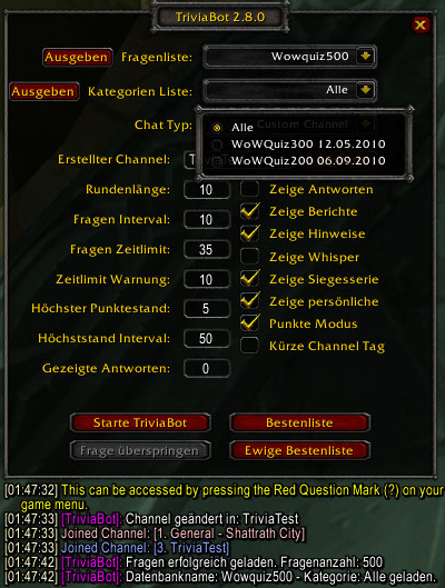 If you wish to join in on the development of TriviaBot and join a really nice Horde guild, then allow me to suggest - Knights of Insomnia - [H] [Mankrik]