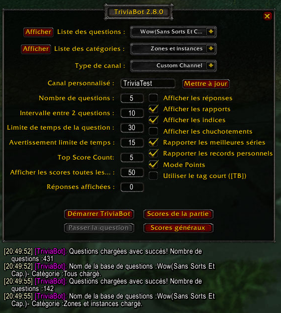 - TriviaBot_QuestionsFR_BFA Authors: Leella-LesClairvoyants, Khamúl-Ysondre et Felheart/Samthefish-ConseildesOmbres (EU)