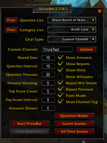 - TriviaBot_QuestionsWoW1 (previously prepackaged as QuestionsTriviaQuestions1.lua) Generic WoW BC/LK era.