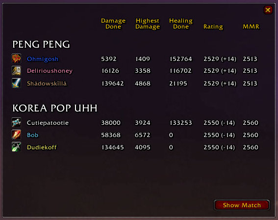 The addon is optimized for high-performance and as few memory usage as possible. Due to these requirements the player uses in play less than 1 MB memory. An average match takes up from 60 ~ 180kb, depends on heavy usage of spells and events (warlocks and resto druids do their job pretty well!). Matches can be deleted to free memory if needed.
