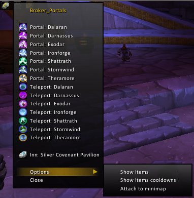 It is designed as DataBroker plug-in, that lets you access all portal and teleport spells from one spot. Addon will be attached to minimap by default, but if you want to move/customize it, you will have to install additional addon like TitanPanel, HidingBar, or Bazooka and there are many more.