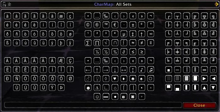 An in-game keyboard of non-standard characters. CharacterMap endeavors to give you quick and easy access to every character supported by the default Windows WoW chat font. Characters are split into different layouts, which can be accessed by modifier keys (on your physical keyboard) or through a dropdown menu. The layouts are as follows: