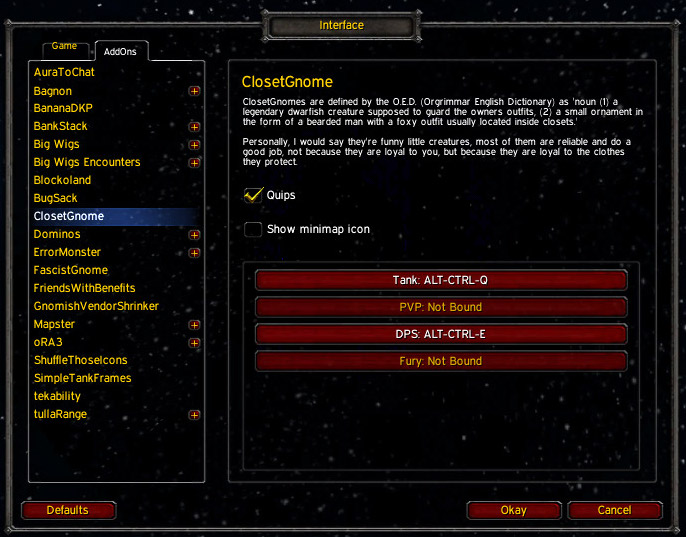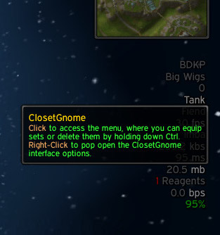 ClosetGnome is just a handy tool over the Blizzard Equipment Manager. It provides you with a nice LDB display and some funny quips when you change equipment sets, plus it allows you to bind keys directly to equipment sets. Yes, yes - you can bind your sets with macros and action buttons and stuff already ... But your ClosetGnome will do it with style!