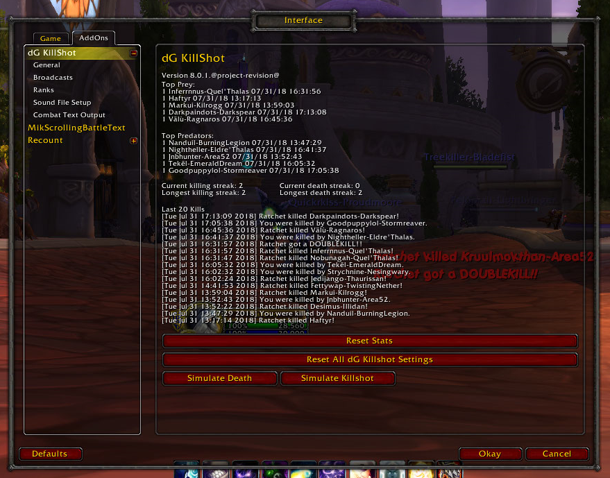 Plays Unreal Tournament style sounds when you get a Killshot! It keeps count of your streaks working well with War Mode. It also tracks how many times you have killed or been killed by each player. Guild, raid and party communications are built in so it notifies others with that also have the mod that you got the kill-shot. It does this by playing the Unreal Tournament sounds. ("Ownage!", "Killing Spree!", "Dominating!", "Unstoppable!", "Godlike!", and "Wicked Sick!")