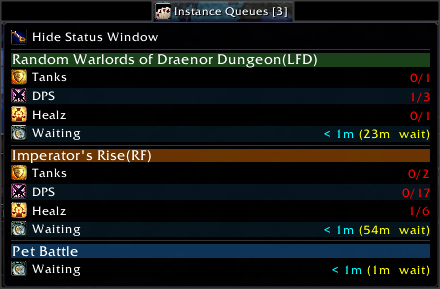 Dungeon Status is a small add-on that provides a small movable window showing the current status of you looking for dungeon status. It appear when you queue for events and disappears when you exit all queues. There is a button to close the window and it will stay closed until the server updates your queue.