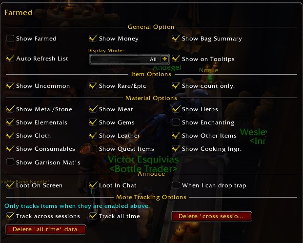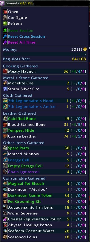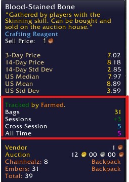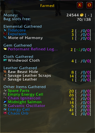 Farmed understands the items that are typically farmed and automatically provides a categorised count of those items in you bags.. The features are:-