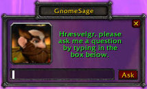 Description: Need help making decisions such as whether you should buy that sweet upgrade, or say no to a random /tell asking you to heal for a pick up group? Well look no further, with Gnome Sage you can now ask your very own pocket gnome soothsayer. Just ask him your question and through gnomish ingenuity and experimentation, he will express his agreement or counsel caution. On occasion, Gnome Sage may even express bewilderment when the dilemma is not as cut-and-dried as it seems to be.