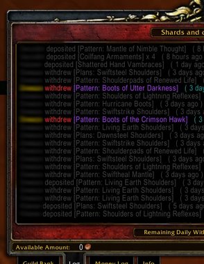GuildBankSearch adds a filter to your guild bank window to easily find things in cluttered tabs. It searches both the items in your bank and the log text quickly and intuitively.