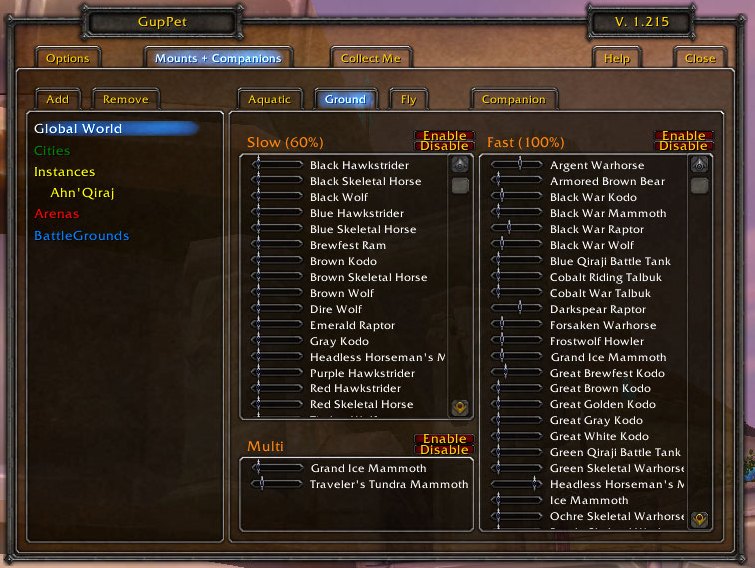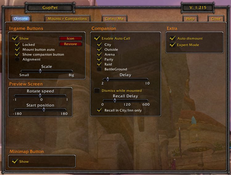 GupPet is an add-on that gives an extension for mounting and calling critters. By a single click it mounts a ground, swimming or fly mount depending on the players location. Because most players have plenty of mounts and companions, and you probably like more than one, the add-on can randomly select mounts/companions depending on the selections in the option menu.