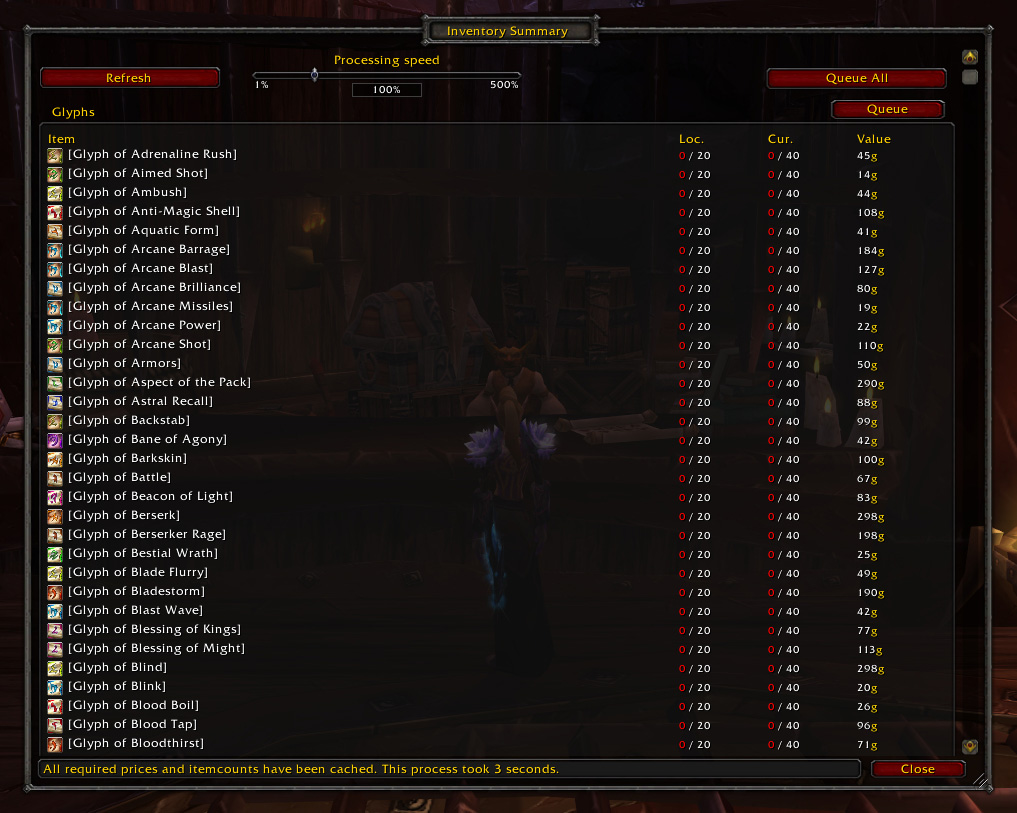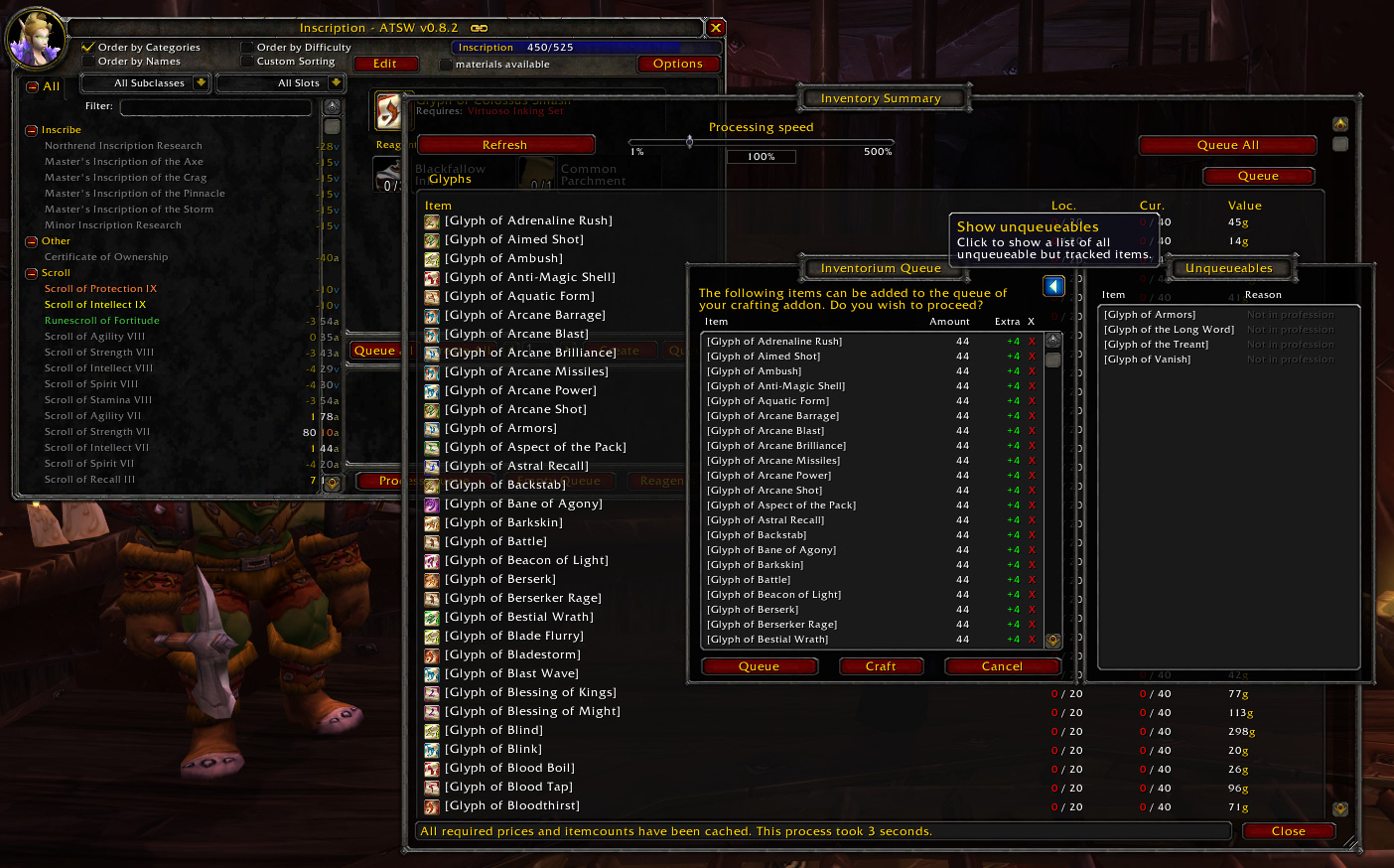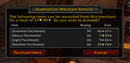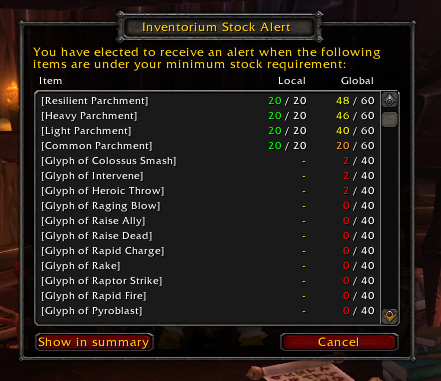 Inventorium keeps track of selected items in your inventory and can provide a summary to quickly get an overview of your current stock. It also provides profession queuing, storage refilling and merchant restocking functionality to make it a lot easier to keep enough inventory with you at all times.Through grouping it should be very easy to configure everything exactly to your likings. The config should already feel very familiar to experienced users of addons like Quick Auctions and others can find a user manual in the addon directory to learn how to use it.