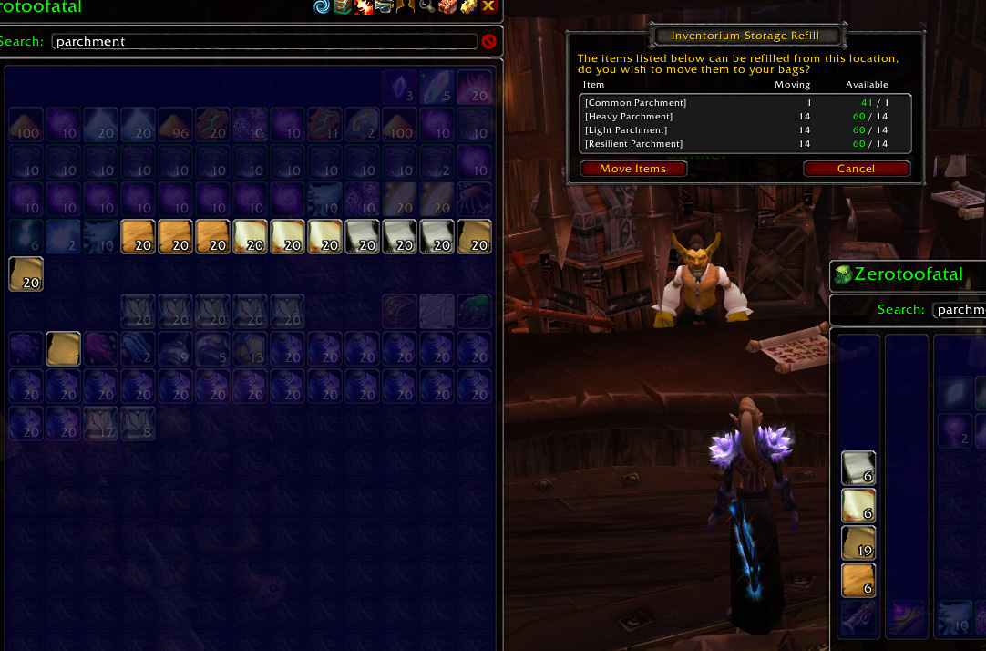 - Storage refilling (automatically move missing items out of your bank, guild bank or mailbox).