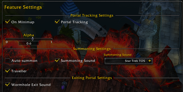 This feature allows you to see where a portal has been made by someone in your group on the map. Each portal is shown using the icon for that spell, i.e. the Stormwind portal marker on the minimap uses the Stormwind portal spell icon. They are not the best quality of images, since I took all of the extra stuff from them, making them circles. I am hoping to add a chevron arrow to point to portals off the minimap, but I am not good at art. If anyone has a small, like 16 x 16, chevron I could use, that would be nice.