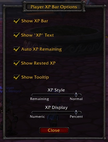 To show the options menu, type /xpbar in a chat dialog box or you can bind a key in the Key Bindings Menu.