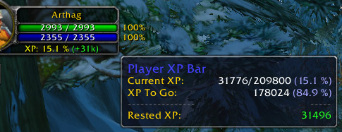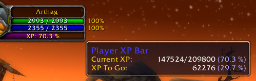 This addon adds a little XP Bar under your portrait. XP is shown in percentage, you see when you have rested XP (show "(+xxx)" in the bar) and the bar has the same colors as the original XP bar (purple for normal xp and blue for rested xp). When you rollover the bar, you see details about your XP and XP to go (numeric & percent values).