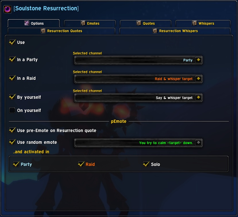 ..fixed or random pre-emote & quote incl. whisper to target for Soulstone Resurrection.