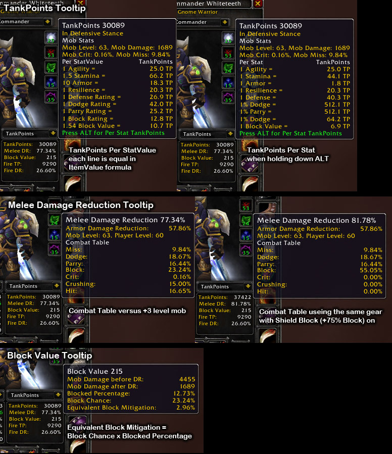 - Block Value tooltip - Block Value should have been included in the default UI, but they didn't so I coded my own function that does it, strength, items, talents(warrior, paladin, shaman) are all considered in the algorithm.