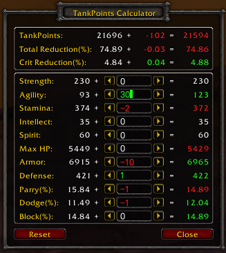 TankPoints was created to help myself compare different pieces of tanking gear, because it was difficult to decided at a glance like whether 12 defense is better then 1 dodge.