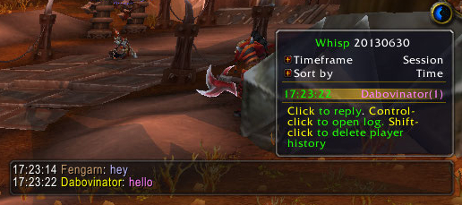 Whisp keeps track of your recent conversations and displays them in a pane above the chatbox when you reply. Whisp also comes with a LibDataBroker (LDB) plugin or Mini-map button that allows you to quickly review all conversations.